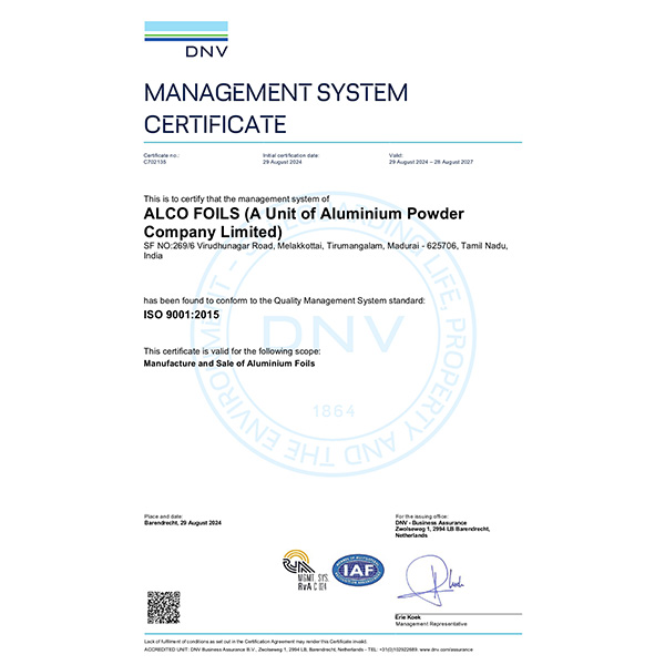 ALCO FOILS (A Unit of Aluminium Powder Company Ltd), a brand new company which is a leader in the production of Aluminium Foils, for the applications of Semi Rigid Containers wrt Food packaging, Pharma & Blister packaging and General House Foils, having world class infrastructure with capacity of 350 Tons per Month. Our manufacturing processes are controlled by PLC for better quality assurance and enhanced safety.